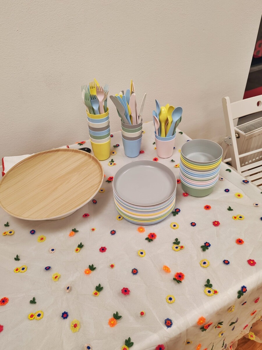 nádobí pro servírování během celé oslavy (talířky, kelímky, příbory, nůž, podnos)