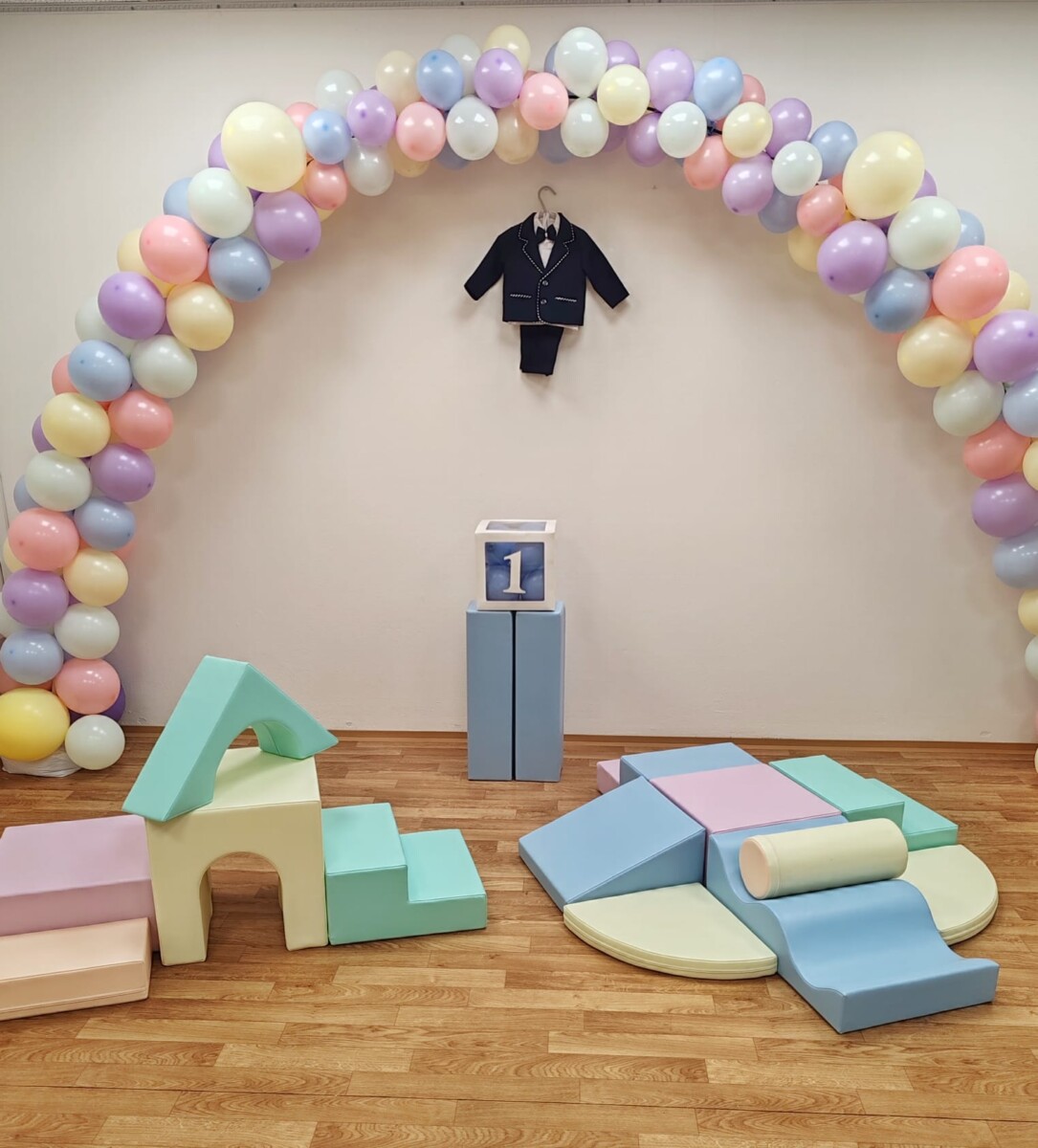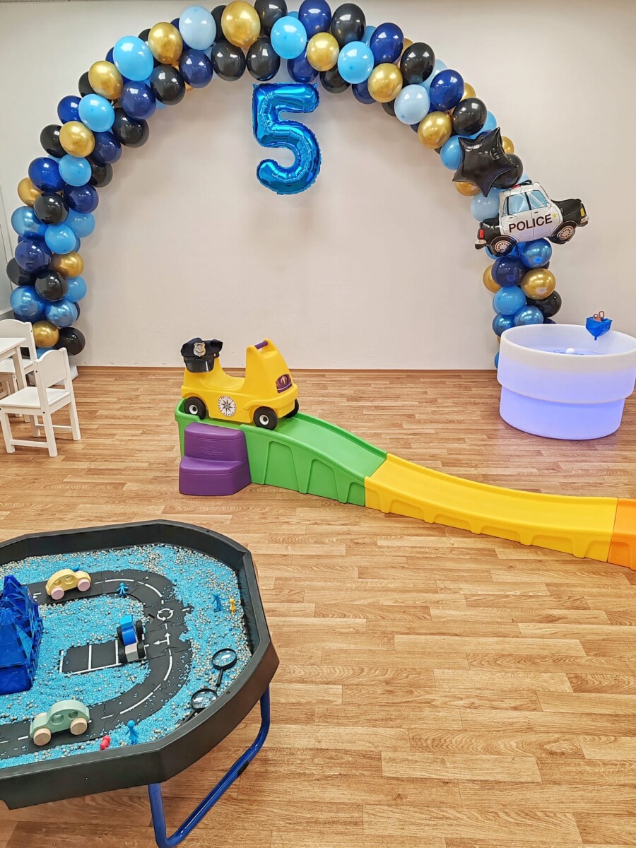 Součástí oslavy je dekorace na balónkové obruči, číslo věku oslavence a tematický balónek dle výběru (např. Tlapková patrola, Frozen, Dino, Princezna apod.).