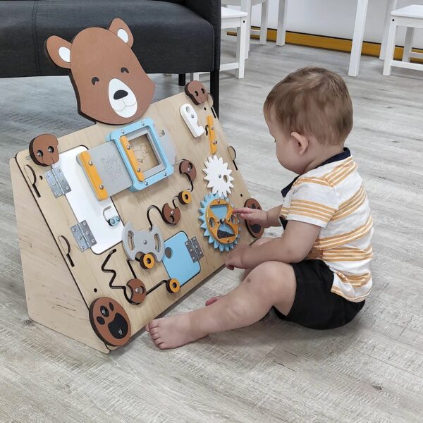 Activity board deska medvěd k postavení na podlahu nebo k zavěšení na zeď je zábavnou výukovou hračkou pro holčičky i kluky. Dle pedagogického směru montessori vedou activity boardy děti k učení se skrze jejich přirozenou chuť objevovat a hrát si.