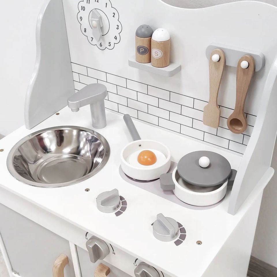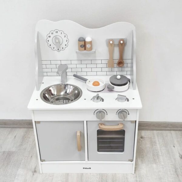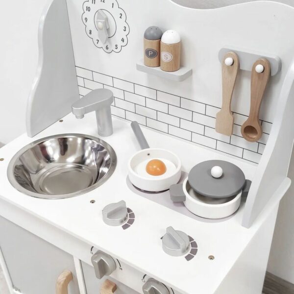 Dřevěná kuchyňka potěší každou malou kuchařku i kuchtíka. V kuchyňce se sporákem, troubou, dřezem na nádobí, skříňkou pro uložení nádobí, hodinami. Dále tu najdeme poličku s kořenkami a věšákem na kuchyňské náčiní. Děti se tak mohou pustit do práce. Mohou zde vařit, péct a přípravovat své oblíbené pokrmy.