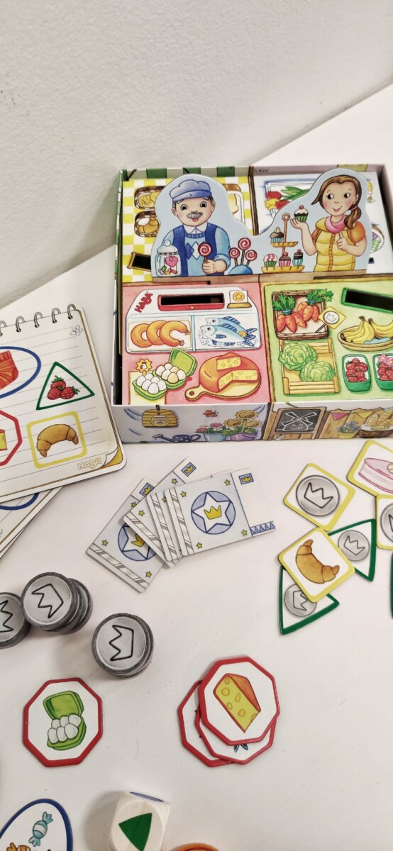 V Haba hře nakupování se děti zábavným způsobem učí nakupovat na trhu. Každý z hráčů má svůj nákupní seznam se čtyřmi položkami. Jednotlivé položky může zakoupit ve stáncích pomocí hodu kostkou. Za nakoupené zboží musí zaplatit uvedenou cenu. Hráč, kterému se jako prvnímu podaří zaplnit svůj nákupní seznam, vyhrává. Děti se učí poznávat hodnotu peněz, orientovat se ve zboží na stáncích. Hra je pro 4 hráče. Délka hry cca 10 minut