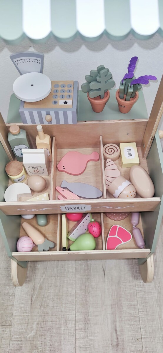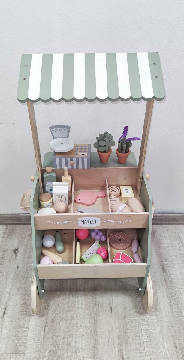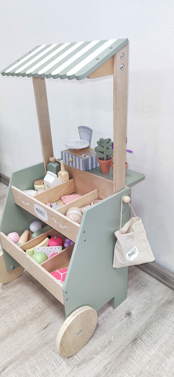 Plně vybavený dětský dřevěný prodejní stánek pro každou malou obchodnici i malého obchodníka.